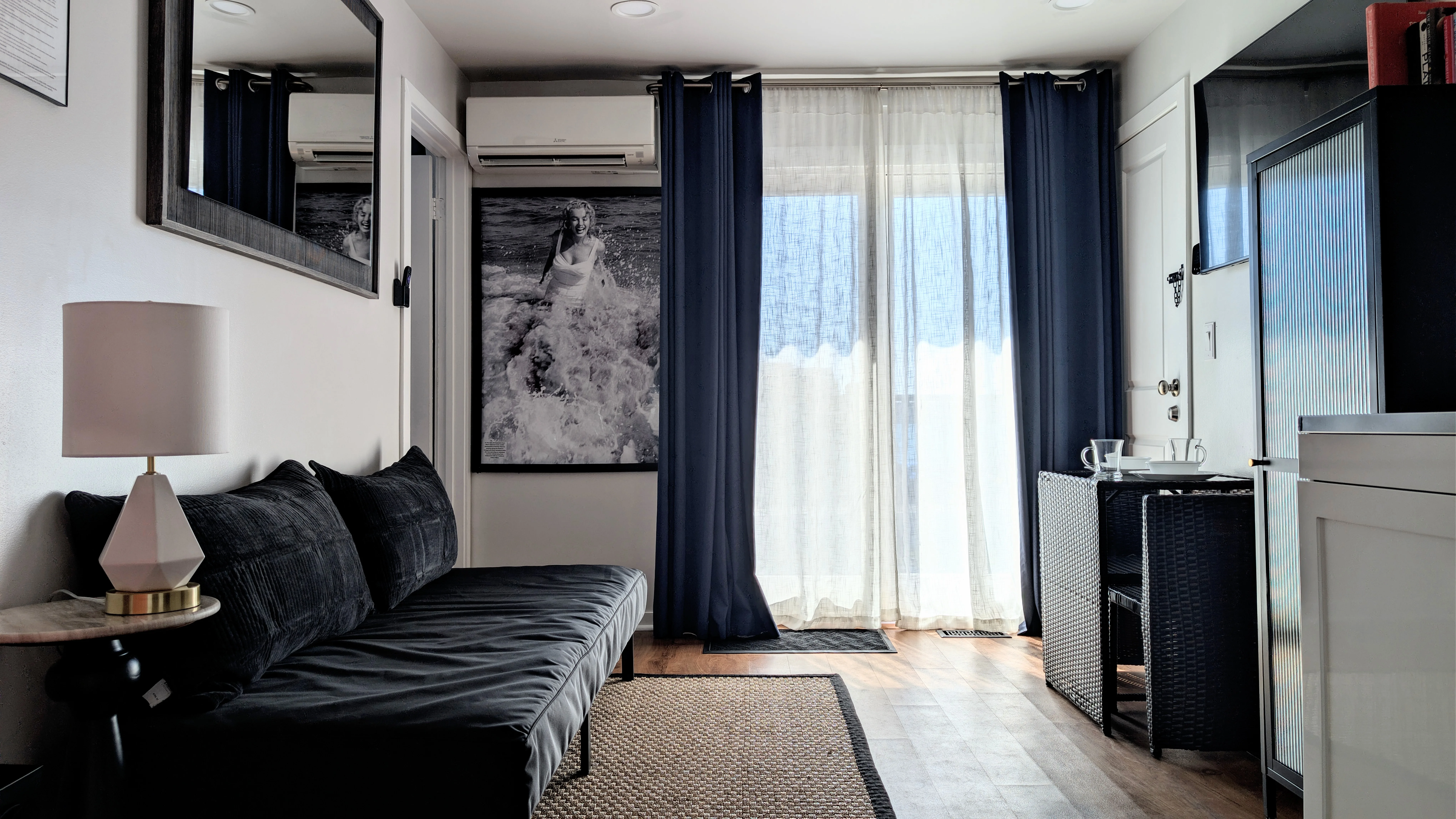 A complete home away from home with a separate bedroom, living room, and full kitchenette. The bathroom features both a standing shower and a double soaker tub. Step outside to your private side patio with picnic table and grill — perfect for a Hamptons evening. Samsung Smart TV in both the bedroom and living room.